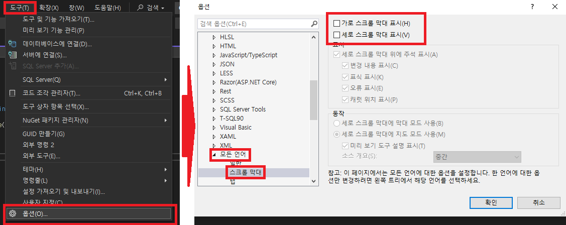 도구 > 옵션 > 모든 언어 > 스크롤 막대 > 가로 스크롤 막대 표시 체크 해제, 세로 스크롤 막대 표시 체크 해제