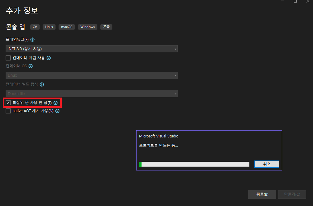 * 실습할 때, 최상위 문 사용 안함(T) 체크