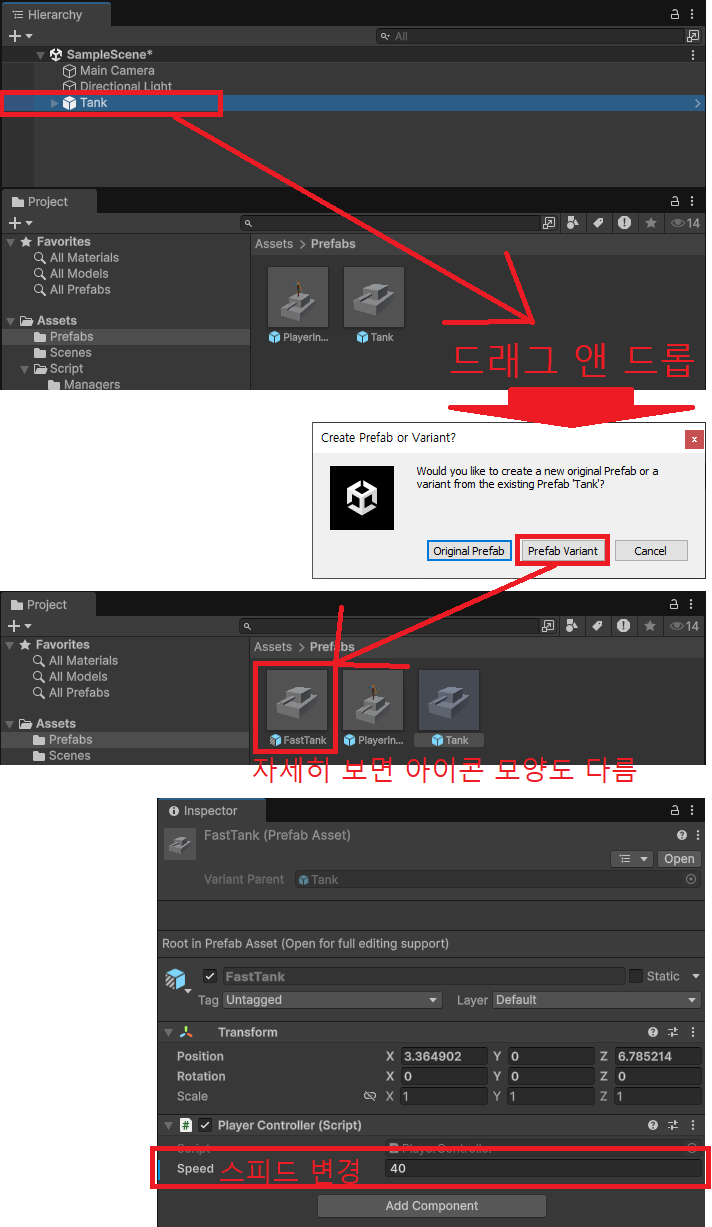 (예) PlayerInTank 프리팹 안에 Player와 Tank 프리팹이 중첩(Nested) 되어 있는 구조