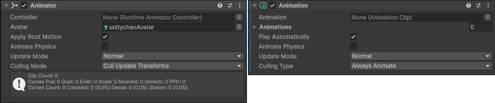 | Legacy | 오래된 유니티 애니메이션 시스템(비권장, 구버전 Animation 컴포넌트와 연동됨) |
