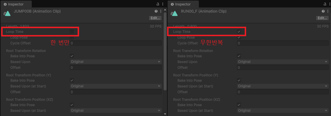 | 정의 | 애니메이션 간 이동경로 | 애니메이션이 끝나고 넘어갈지 말지 결정하는 옵션 |