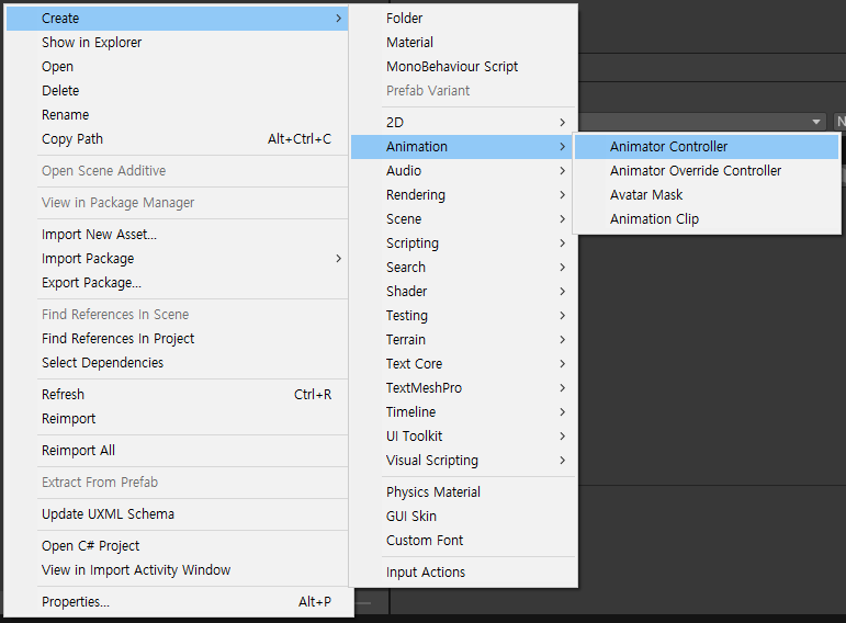우클릭 > Create > Animation > Animator Controller