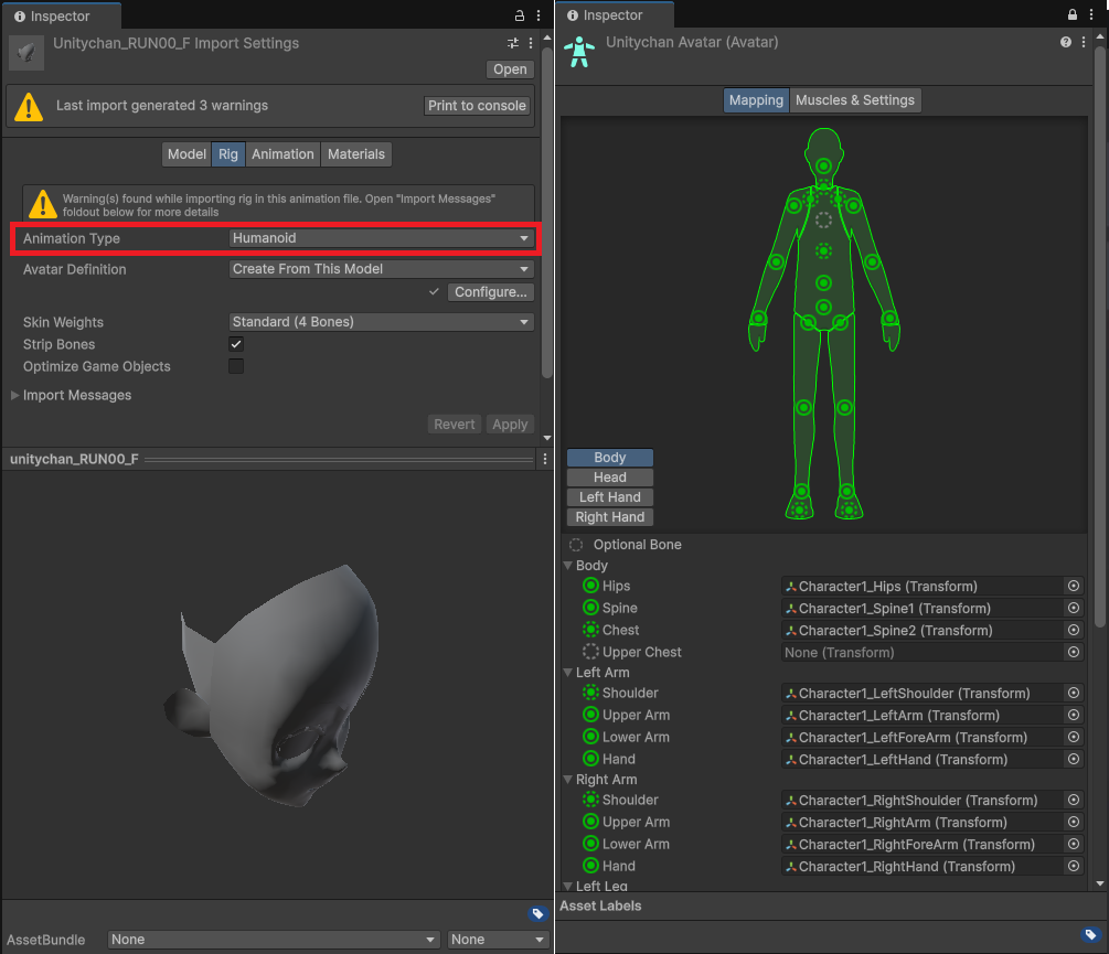 | Humanoid | 유니티의 Mecanim 시스템을 활용한 인간형 리깅 지원 표준 휴머노이드 골격 구조를 이용해 애니메이션 재활용 가능 |