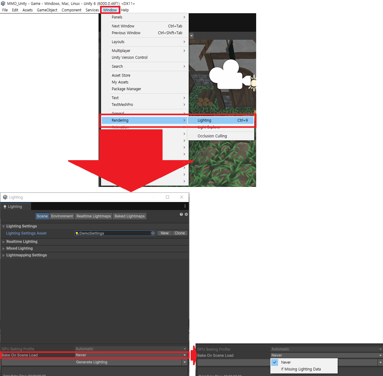 * Bake On Scene Load 드롭다운(유니티 6 이후 바뀐 방식)