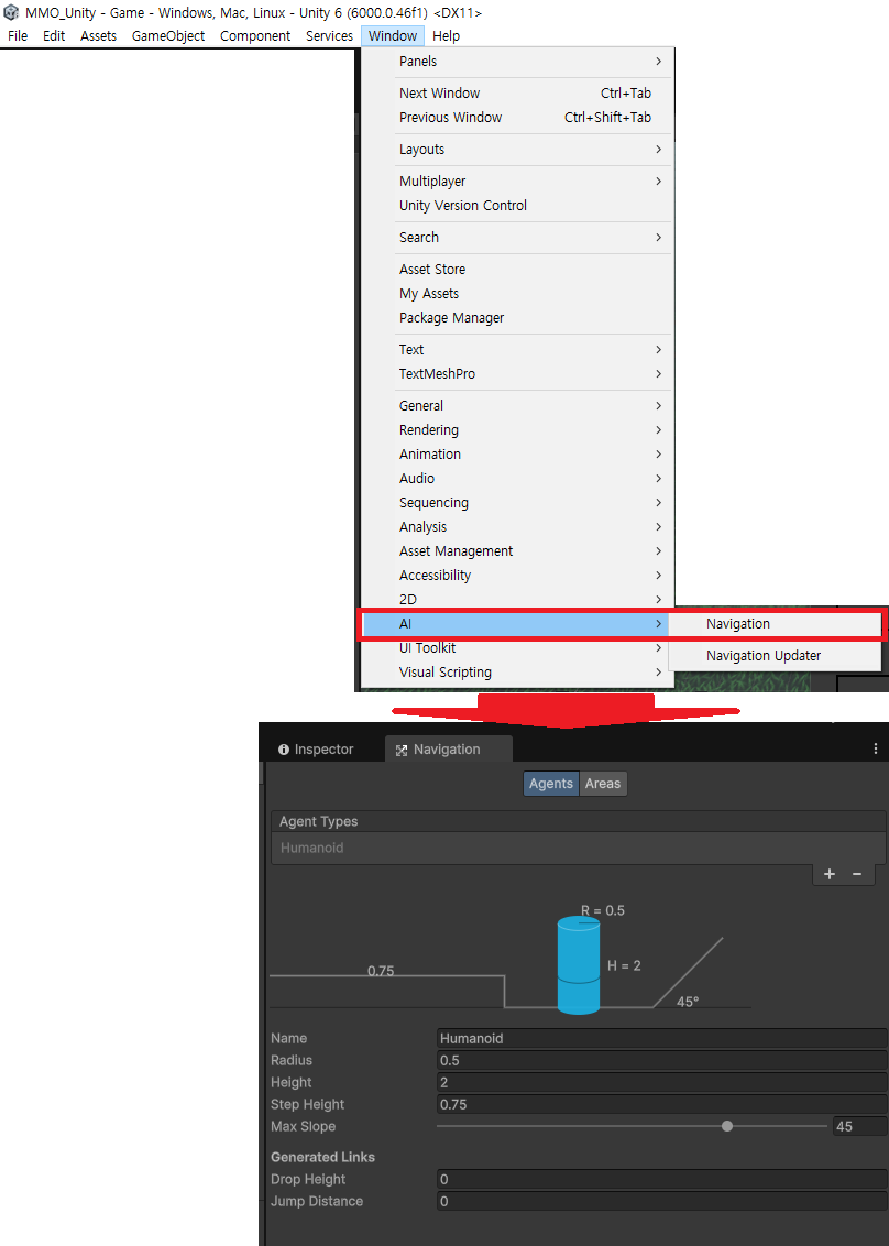 * 유니티6에서는 NavMesh 기능이 패키지 분리되어 기본 설치 상태에서는 보이지 않는다