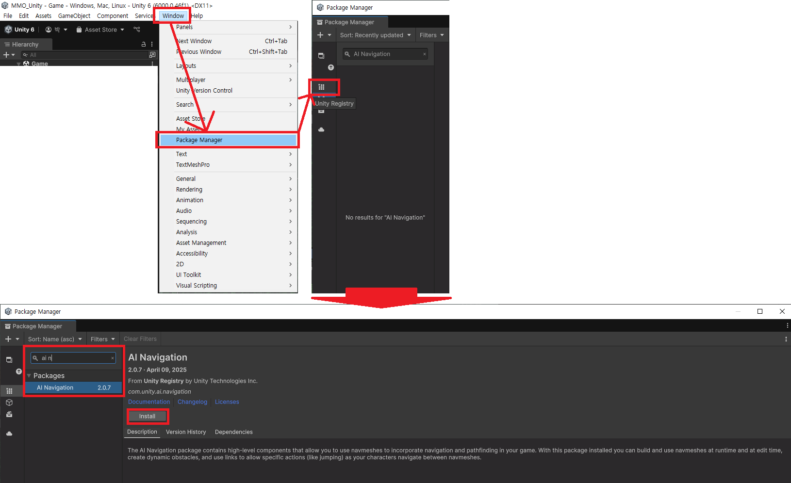 Window > Package Manager > 좌측 상단의 Unity Registry 클릭 > 검색창에 AI Navigation 입력 > Install