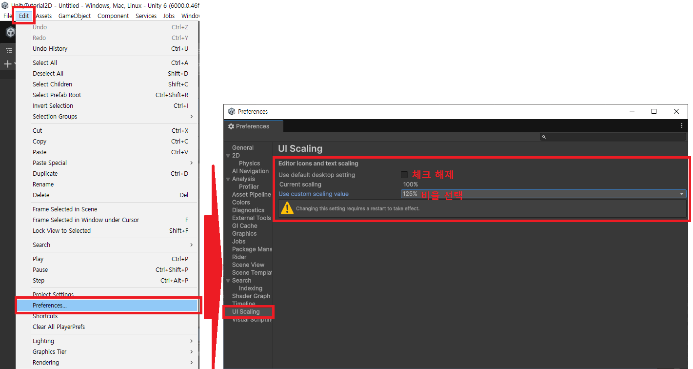 Edit > Preferences... > UI Scaling > 체크 박스 해제 후 원하는 배율을 선택