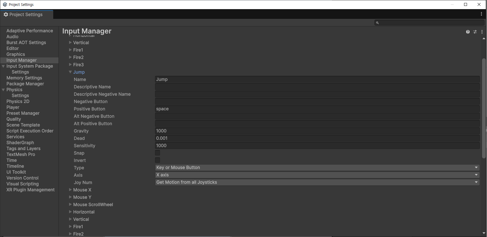 이 방식은 프로젝트의 설정의 Input Manager에서