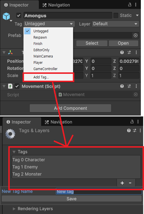 * Tag : 게임 오브젝트의 별명, Layer : 게임 오브젝트의 소속