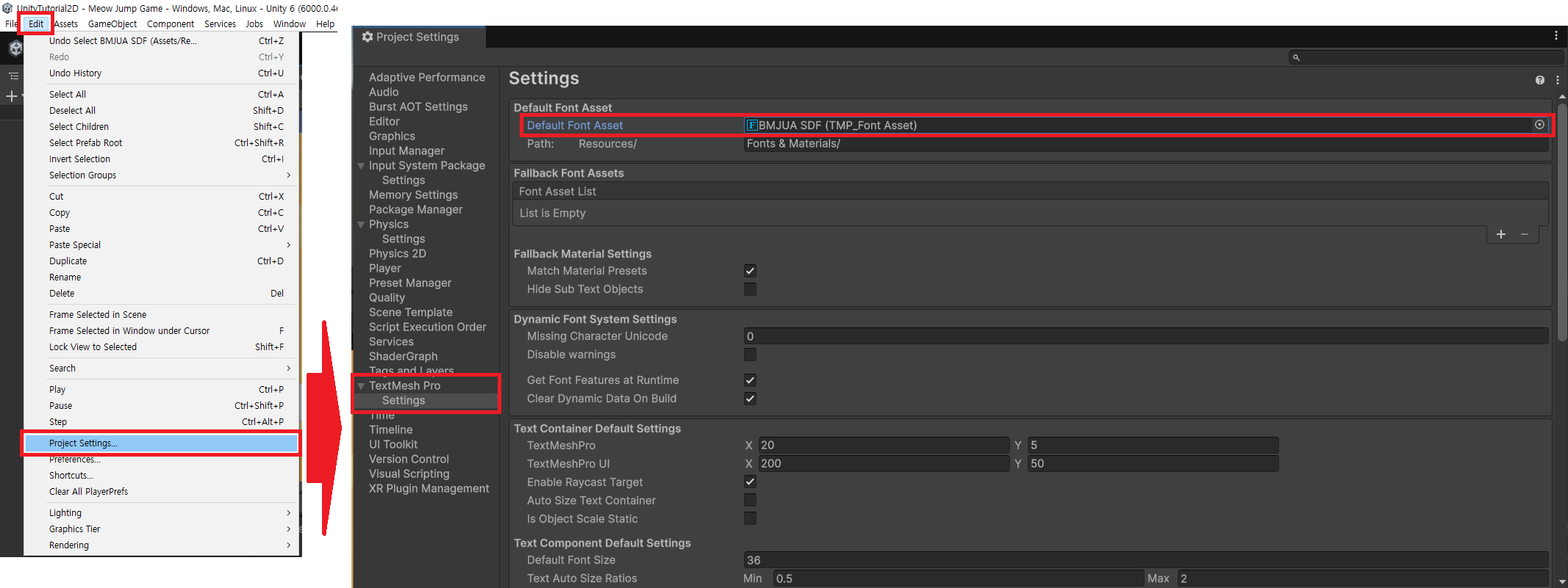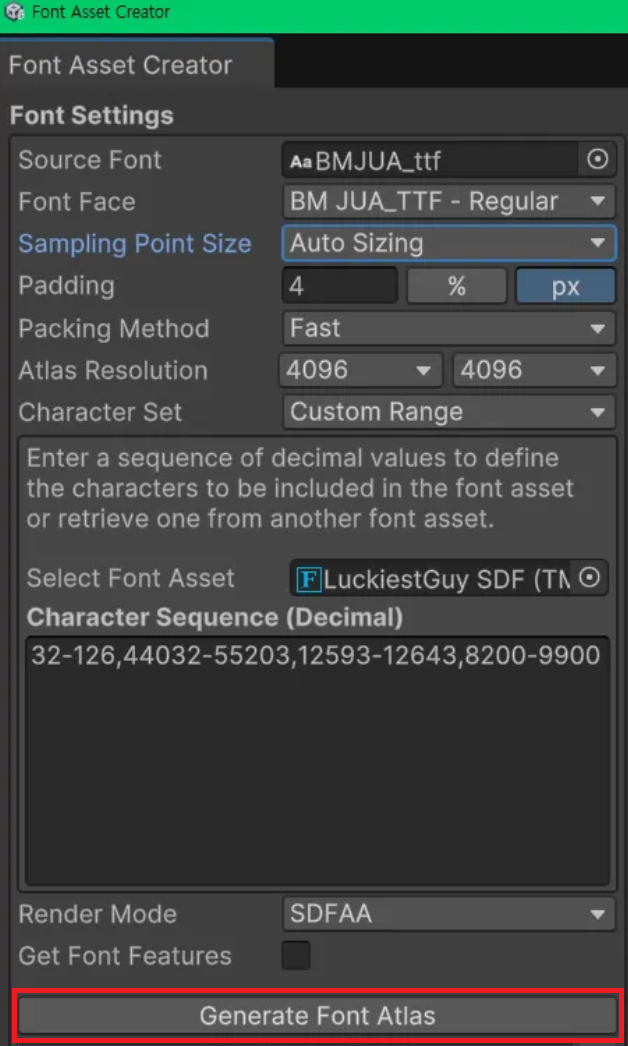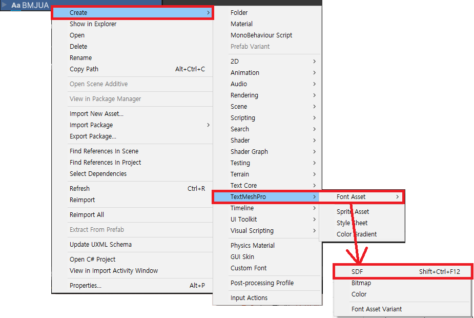 우클릭 > Create > TextMeshPro > Font Asset > SDF
