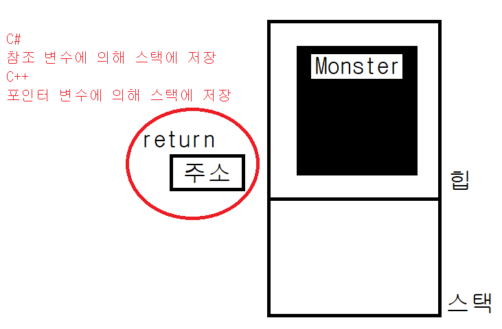 스택변수 monster에는 힙 객체 주소가 참조 형태로 들어 있음