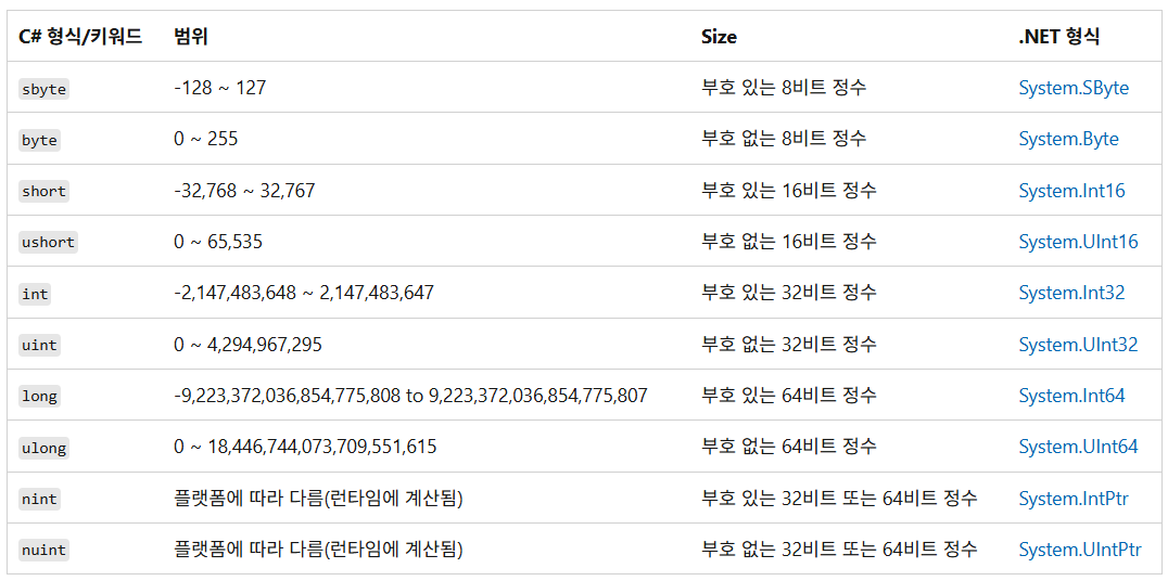(1) 정수를 저장할 수 있는 여러 C# 타입들