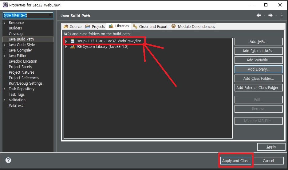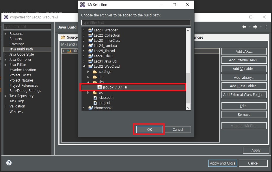 > jsoup-1.13.1.jar 클릭 > OK 클릭
