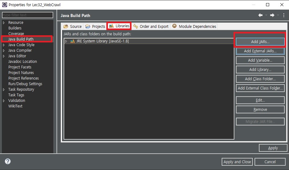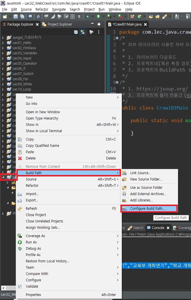 : 프로젝트 폴더 클릭 > 우클릭 > Build Path > Configure Build Path