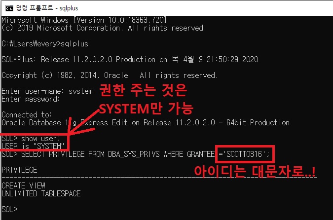 [권한 확인] SELECT PRIVILEGE FROM DBA_SYS_PRIVS WHERE GRANTEE ='SCOTT0316';
