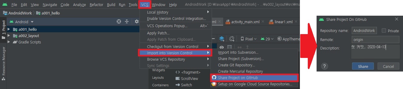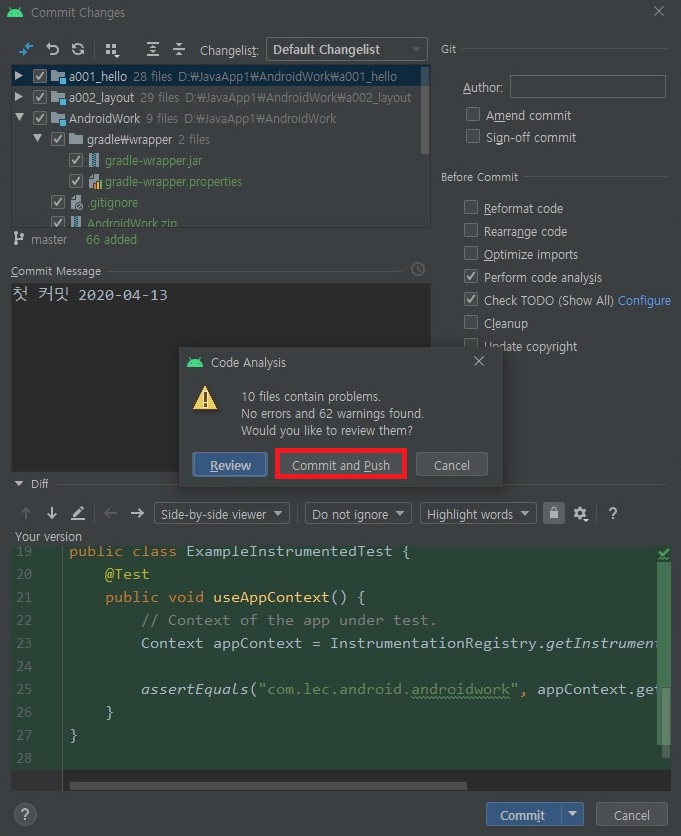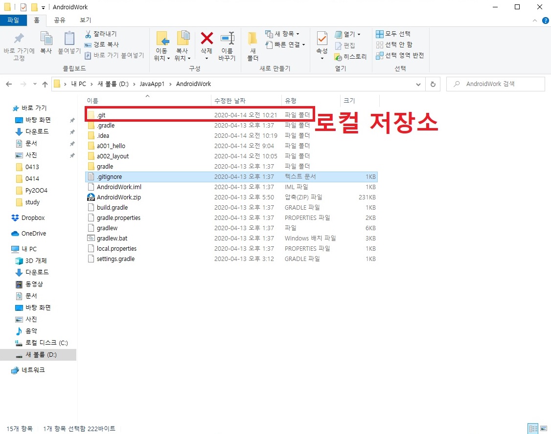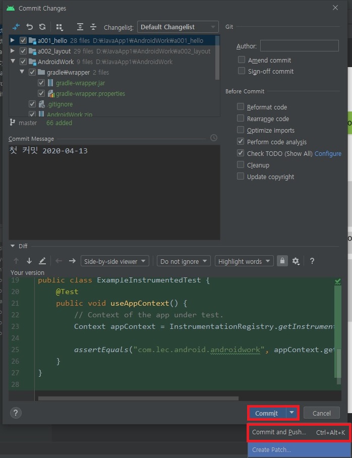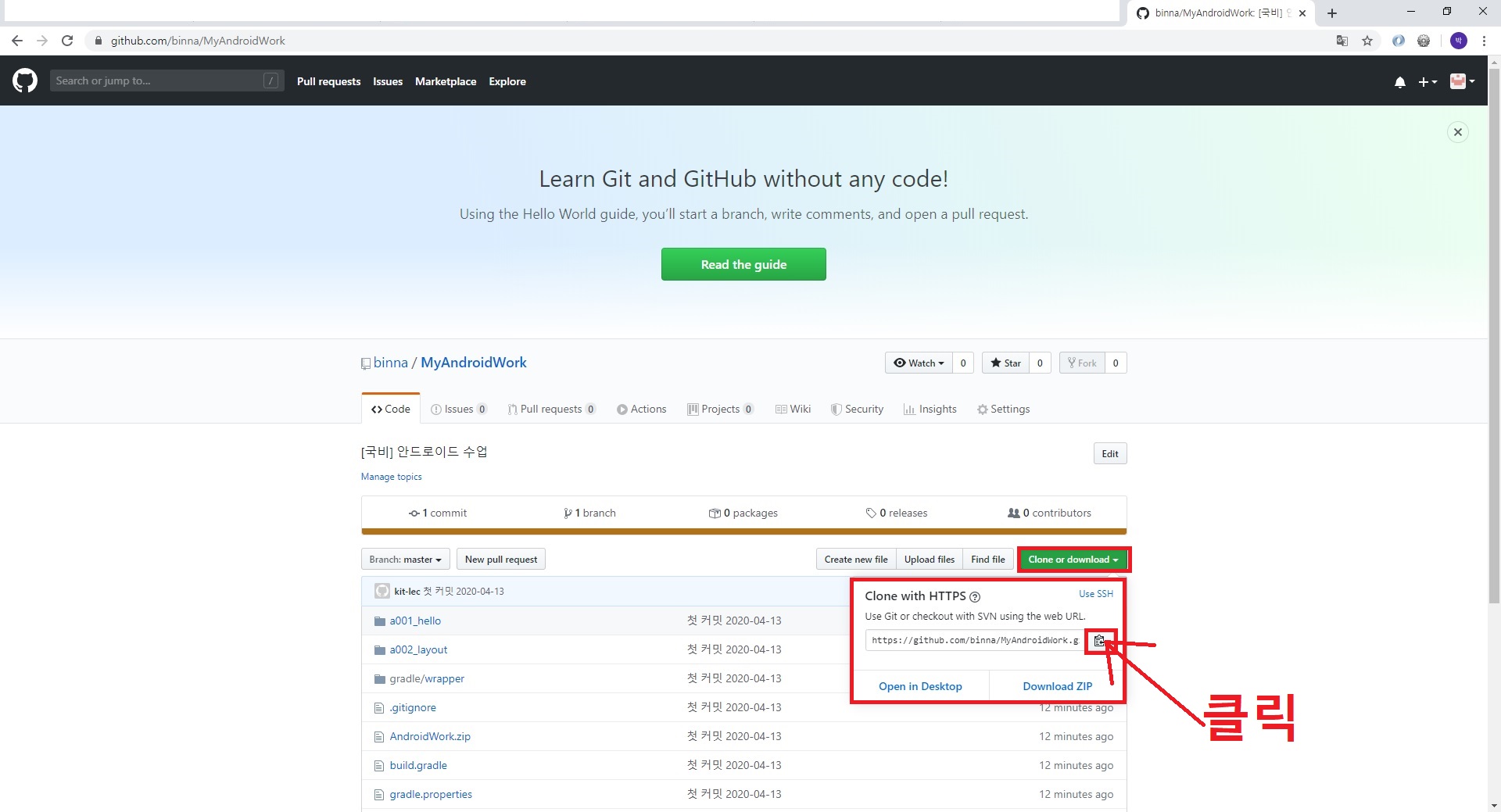 ('첫 커밋, 2020-04-13'으로 설정했던 이름은 Edit를 통해 '안드로이드 수업'으로 변경함)