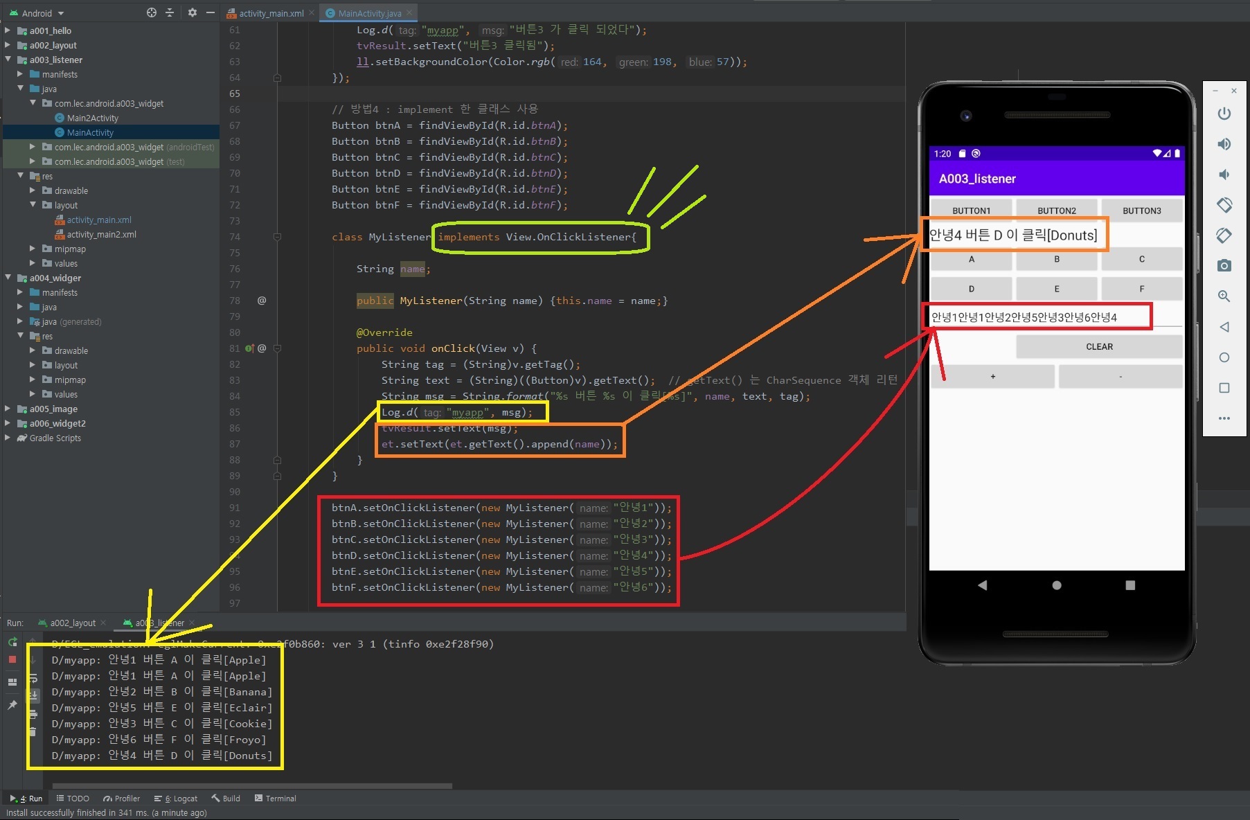 예) '버튼 뷰'에 '클릭 이벤트'가 발생시 동작하는 'OnClickListener'를 작성하여 장착..!!