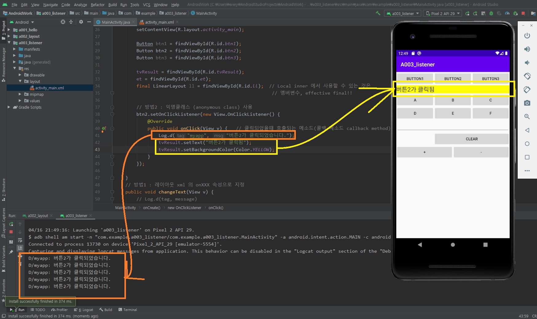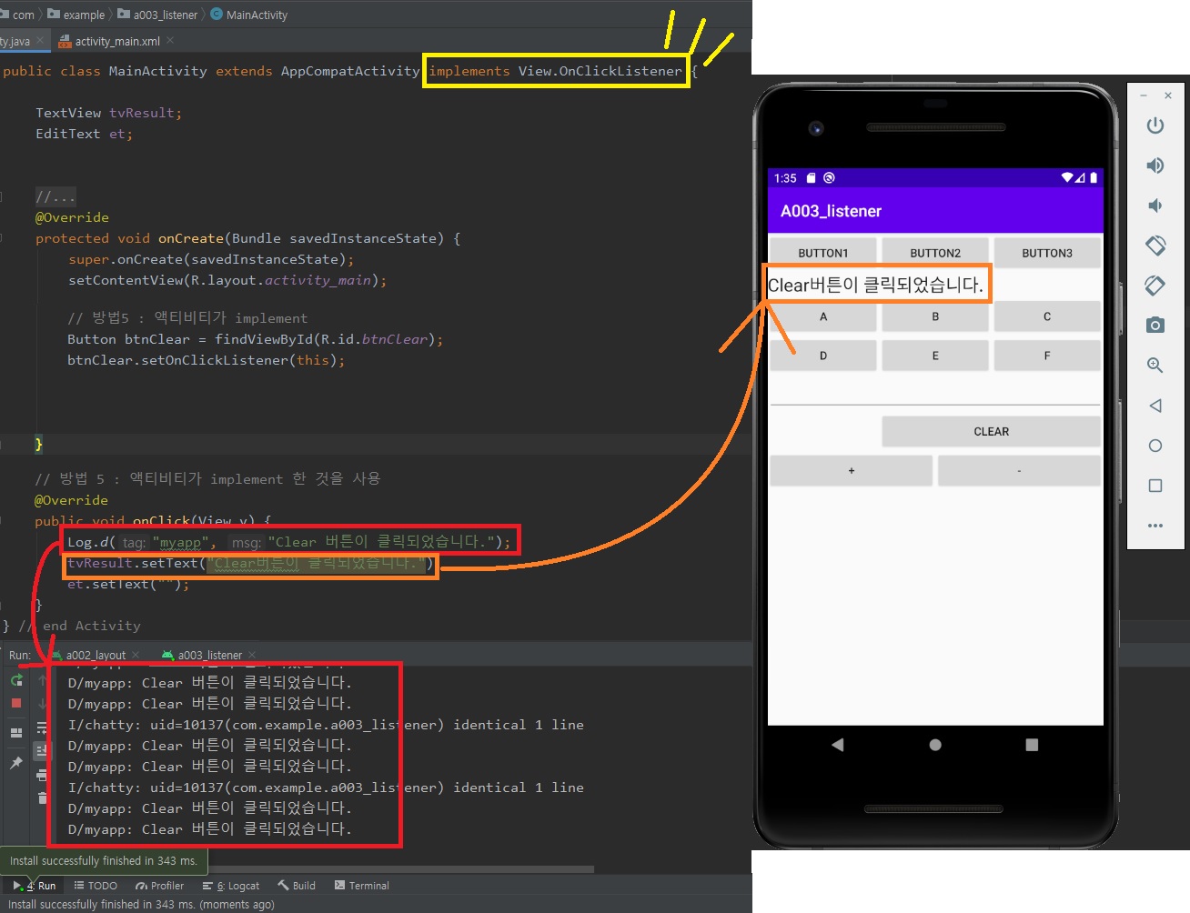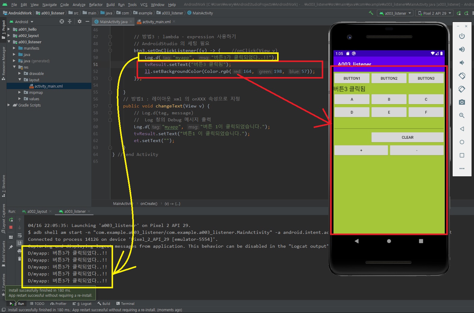 : 안드로이드 프로그래밍은 각각의 '뷰'에 해당 '이벤트'에 대해 이벤트 발생할때 동작하는